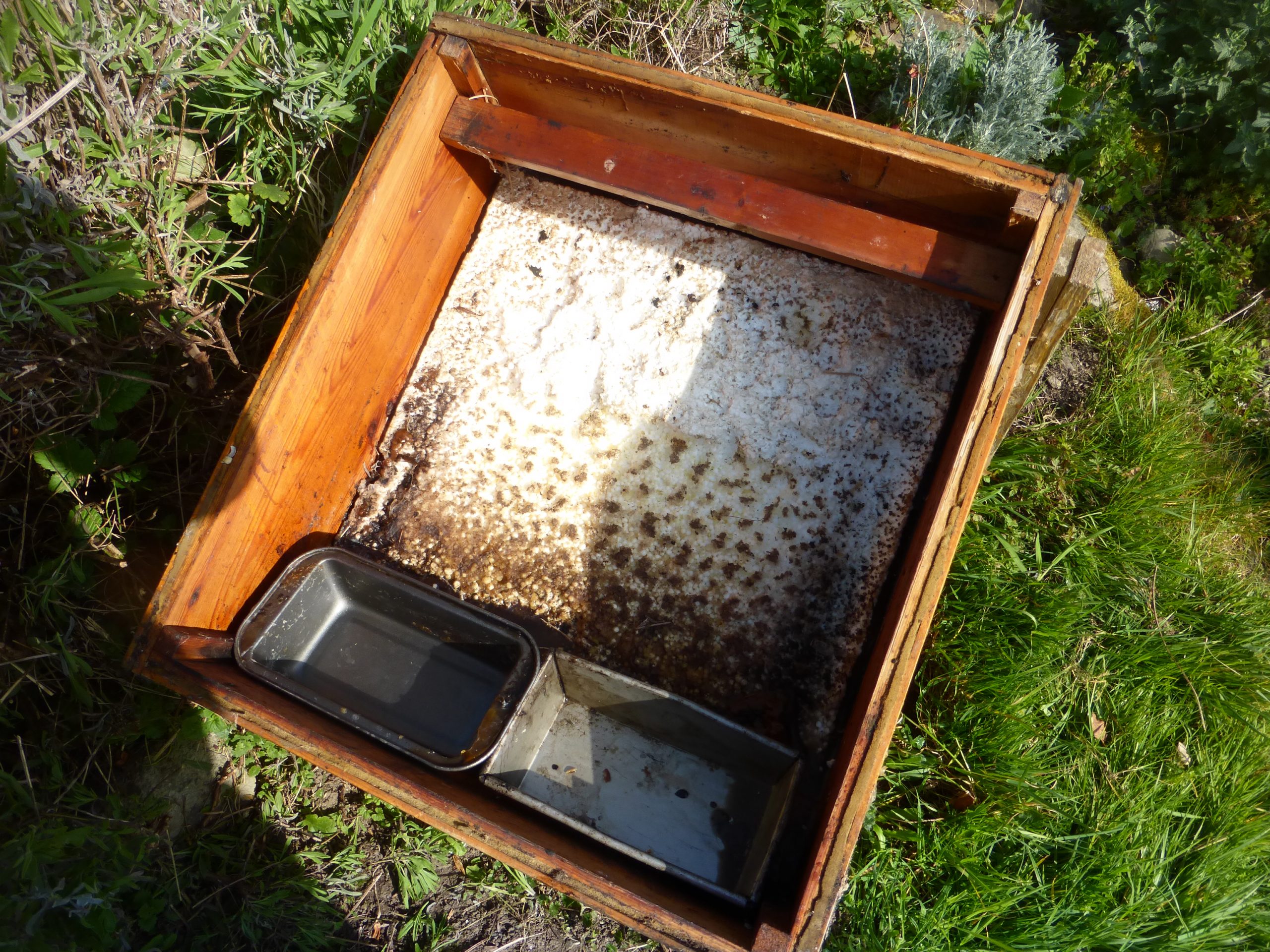 Insulated box, made from old T and G board. Two loaf tins. The metal tray hooks over the top cross piece.